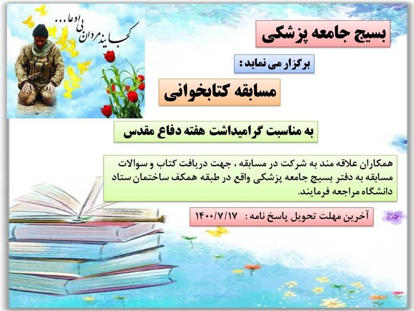 اطلاعیه برگزاری مسابقه کتابخوانی به مناسبت گرامیداشت هفته دفاع مقدس ۲۹ شهریور ۱۴۰۰ | ۱۱:۲۴ کد : ۲۰۲۹۴ اطلاعیه ارسال به دیگران نام شما ایمیل شما ایمیل دریافتکننده ارسال انصراف تعداد بازدید:۲۷۴۸۵