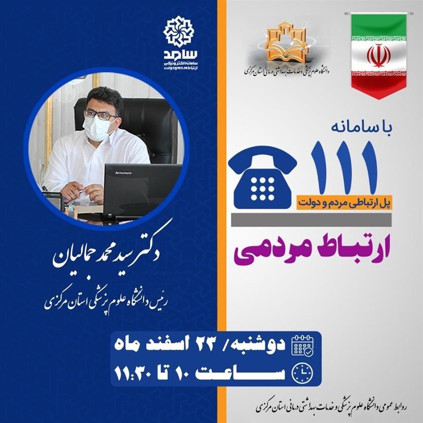 رئیس دانشگاه علوم پزشکی استان مرکزی از طریق سامانه الکترونیکی ارتباط مردم و دولت ( سامد ) در روز دوشنبه مورخ 23 اسفند ماه 1400 از ساعت 10 الی 11:30 صبح آماده پاسخگویی به مشکلات شهروندان می باشد.