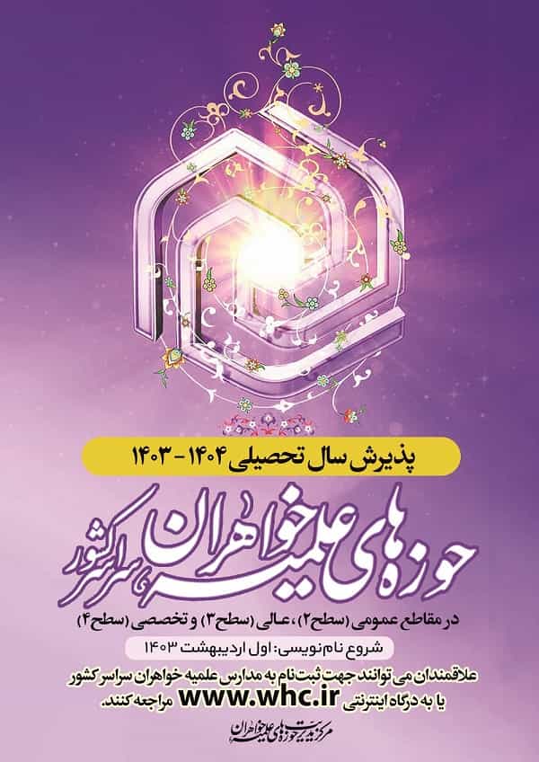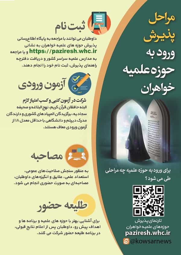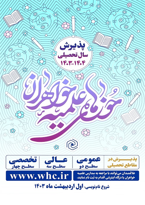 با عنایت به آغاز پذیرش حوزه های علمیه خواهران در مدارس علمیه خواهران استان برای سال تحصیلی 1404 - 1403 ، به منظور جذب خواهران ولایی و متدین ، جزئیات ثبت نام در بروشورهای پیوست اعلام می گردد.