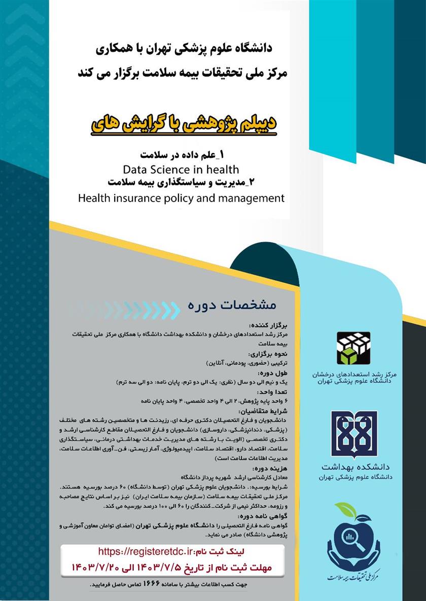 برگزاری دوره دیپلم پژوهشی با همکاری دانشگاه علوم پزشکی تهران و مرکز ملی تحقیقات بیمه سلامت با استفاده از ظرفیت دانشجویان/ فارغ التحصیلان نخبه رشته های علوم پزشکی و سایر رشته ها