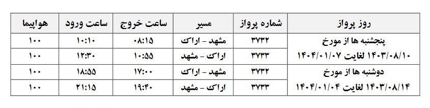 برقرار شدن پرواز مسیر مشهد - اراک - مشهد روزهای دوشنبه و پنجشنبه هر هفته از ۱۰ آبان ۱۴۰۳