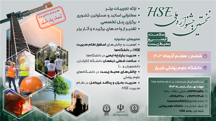 دانشگاه علوم پزشکی شیراز به اطلاع تمامی ذینفعان و گروههای مختلف علمی آموزشی و پژوهشی می رساند ، در راستای برگزاری جشنواره ملی سلامت ایمنی و محیط زیست (HSE) در دانشگاه های علوم پزشکی و پیرو درخواست مکرر برخی از واحدهای دانشگاه ها مبنی بر تمدید مهلت ارسال آثار، دبیرخانه جشنواره، جهت ایجاد فرصت بیشتر در تهیه و ارسال مستندات ، مهلت ارسال آثار و گزارش عملکرد واحدهای HSE را تا تاریخ ۲۲ آبان ۱۴۰۳ تمدید می نماید.