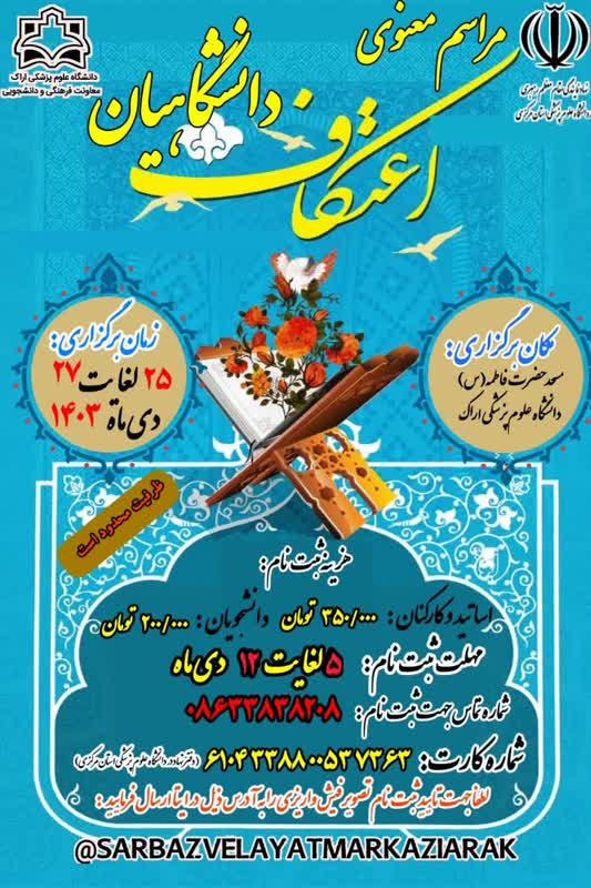 بنا بر اعلام دفتر نهاد نمایندگی مقام معظم رهبری در دانشگاه علوم پزشکی اراک، مراسم معنوی اعتکاف دانشگاهیان به شرح پیوست برگزار می گردد.