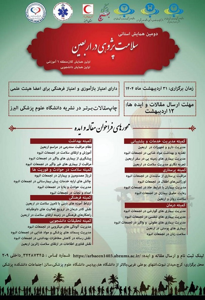 به اطلاع اعضای هیات علمی، اساتید، دانشجویان، همکاران و علاقمندان پژوهش می رساند، معاونت آموزشی دانشگاه علوم پزشکی البرز در نظر دارد، با توجه به اهمیت و ارتقاء سطح سلامت افراد شرکت کننده در تجمعات انبوه، با تاکید بر راهپیمایی اربعین حسینی " اولین همایش کلان منطقه شش آموزشی و دومین همایش استانی سلامت پژوهی در اربعین، همراه با اولین همایش دانشجویی " را در روز چهارشنبه ۳۱ اردیبهشت ماه ۱۴۰۴ برگزار نماید.