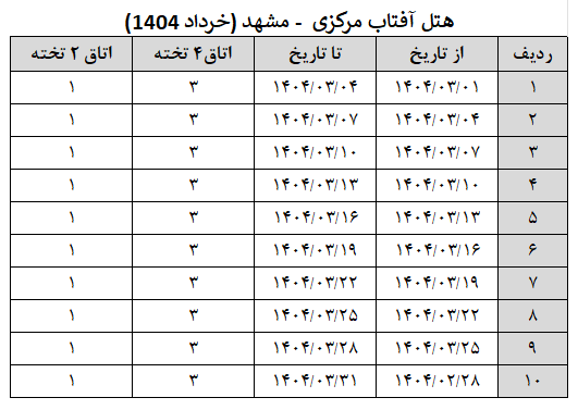 بارگذاری سهمیه خرداد ماه ۱۴۰۴ هتل آفتاب مرکزی ( مشهد )