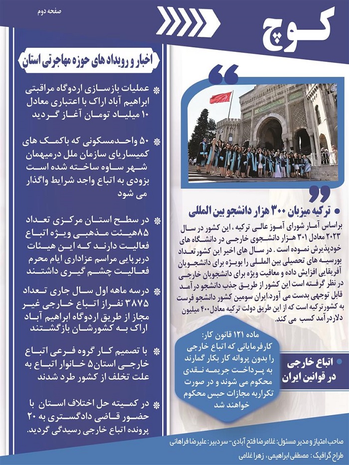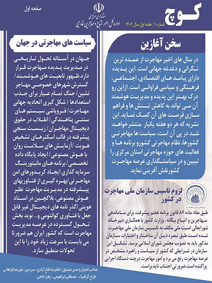 به اطلاع می رساند، مدیر کل دفتر امور اتباع و مهاجرین خارجی استانداری مرکزی، اولین شماره نشریه " کوچ " را منتشر نموده است و به پیوست می باشد.