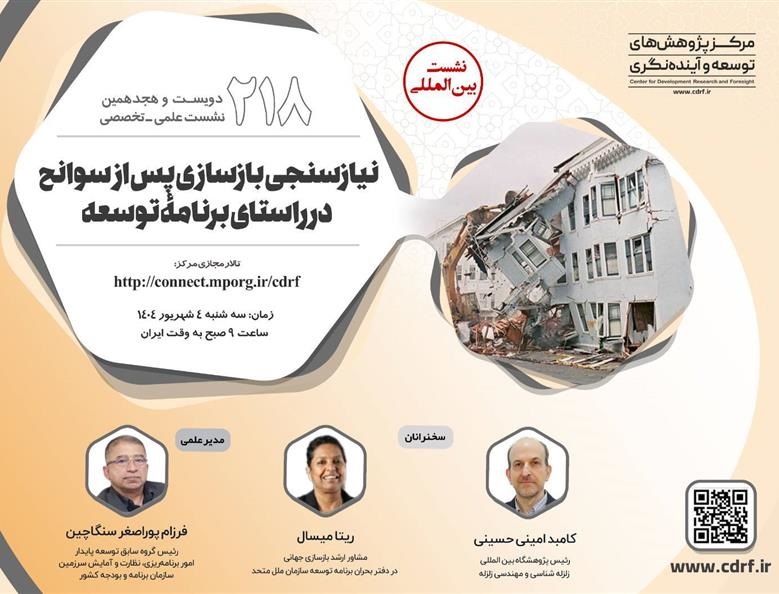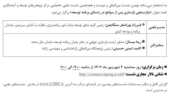 نشست علمی نیاز سنجی بازسازی سوانح در راستای برنامه توسعه ۰۳ شهریور ۱۴۰۴ | ۱۲:۳۷ کد : ۵۴۰۰۰ اطلاعیه ارسال به دیگران نام شما ایمیل شما ایمیل دریافتکننده ارسال انصراف تعداد بازدید:۲۱۲۴ نشست علمی نیاز سنجی بازسازی سوانح در راستای برنامه توسعه، توسط مرکز پژوهش های توسعه و آینده نگری برگزار می گردد.