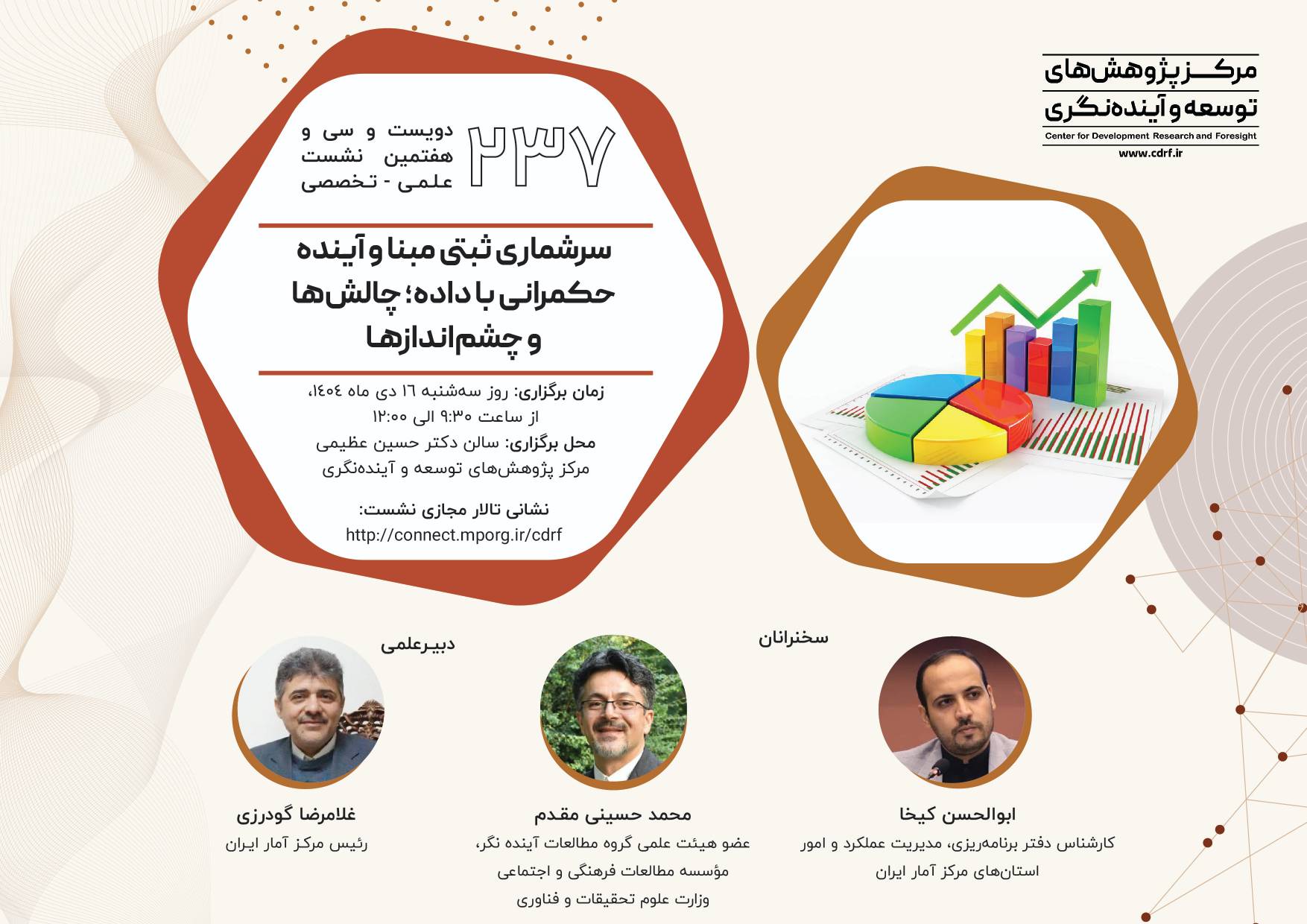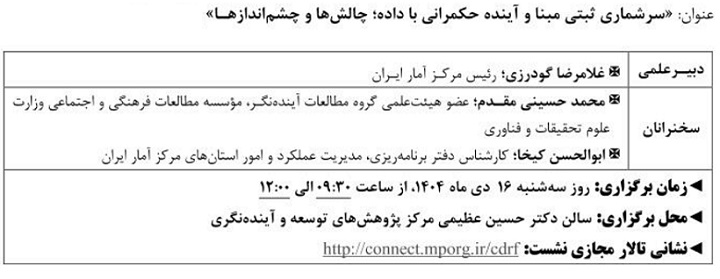 نشست علمی سرشماری ثبتی مبنا آینده حکمرانی با داده ۱۴ دی ۱۴۰۴ | ۱۰:۲۱ کد : ۵۷۴۱۸ اطلاعیه ارسال به دیگران نام شما ایمیل شما ایمیل دریافتکننده ارسال انصراف تعداد بازدید:۵۵۴ دویست وسی وهفتمین نشست علمی - تخصصی با عنوان سرشماری ثبتی مبنا آینده حکمرانی با داده، چالش ها وچشم اندازها